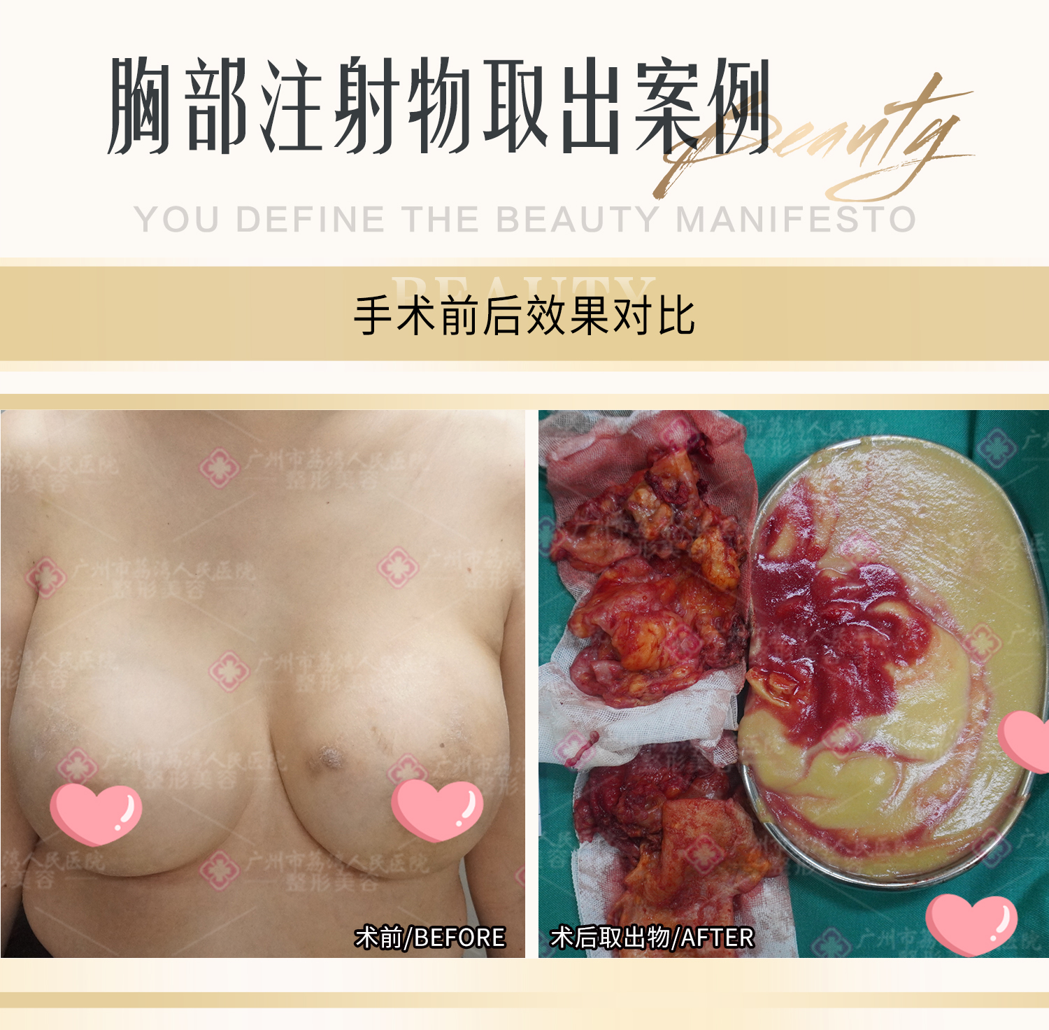 听了他们的建议,艾女士经过多方咨询找到广州市奥美定修复技术研究院(原广州荔湾区人民医院),面诊齐云香。经过检查,才得知胸部注射的材料已经发生了严重的变质,与组织粘附在一起形成了很大的包膜硬块,降解后的材料与水融合在一起形成积液,分散在组织腔隙内各个层次中,取出难度特别大。