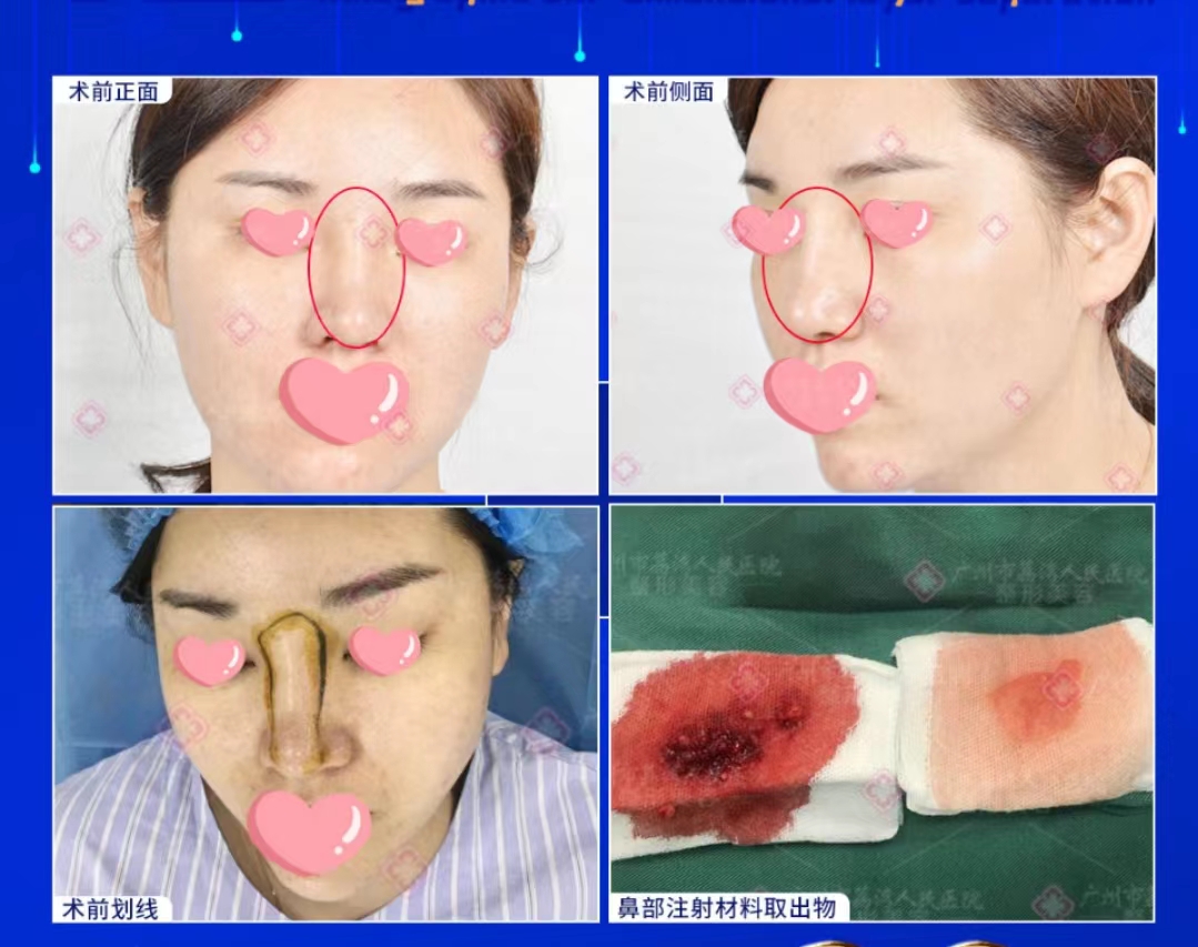经过检查,才告诉她,鼻子内部注射的是非法材料,因为感染已经严重发炎,需要尽早将注射材料取出。且因为注射物降解后具有毒性,对组织的损伤是很大的。为了避免组织引起严重的不适,必须尽早进行手术处理。