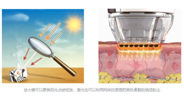 大家小时候有没有用放大镜烧蚂蚁或者课本的经历?这种恶作剧所利用的科学原理就叫做“光热原理”。大名鼎鼎的皮秒,其实就是把“光热原理”玩到极致的产物,它发出的激光可以在瞬间把皮肤里的色素颗粒“烧成”粉尘,随后被身体吸收代谢掉。