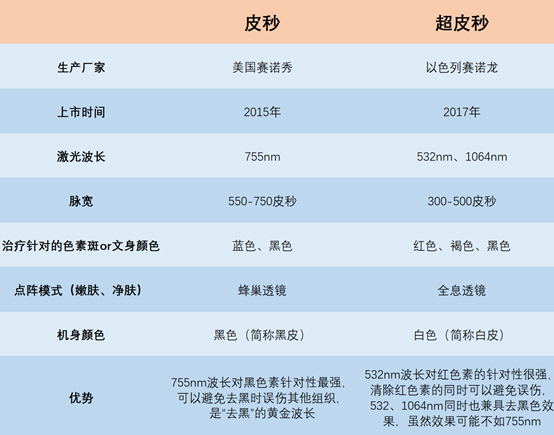 世界上第一款用于医学美容的皮秒激光,是由美国赛诺秀公司生产的Picosure,也就是我们常说的皮秒or蜂巢皮秒。第二款是以色列赛诺龙公司生产的Picoway,也叫超皮秒。二者的共同点是每一发激光的作用时间都成功缩短到皮秒级,不同点是他们所发出激光的波长(颜色)不同,擅长治疗的色素斑类型也不同。皮秒与超皮秒的关系,就有点类似于法拉利与兰博基尼的关系,两者各有千秋,没有谁能绝对碾压对方。