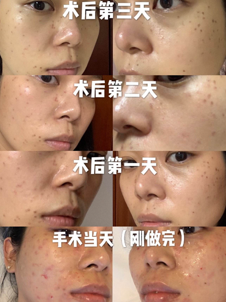 1.做完皮秒后,如果面部有结痂(图中脸上黑色的斑点),结痂的地方48小时内不要沾水,可以点涂生长因子凝胶,每天早晚敷两次医用面膜,促进修复;