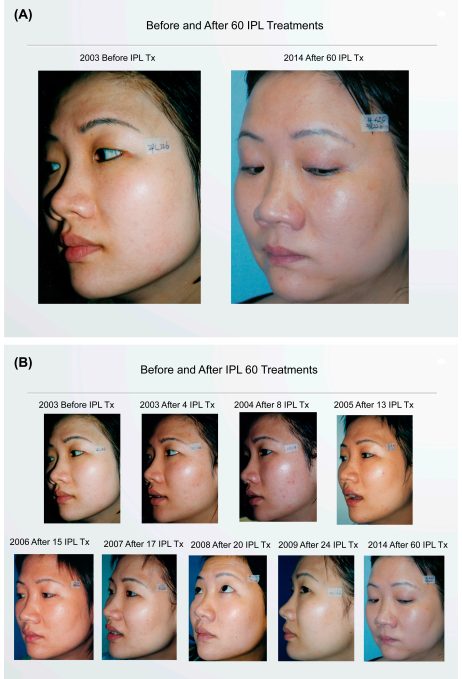 有一项长达12年的光子嫩肤回顾性研究,对2534例光子嫩肤治疗者进行随访,这些人第一年内至少接受了3次光子嫩肤治疗,且后续每年至少接受1次光子嫩肤治疗,结果表明光子嫩肤治疗有效率高达88.24% 至96.45%。也就是说长期的光子嫩肤治疗(例如12年)对绝大部分人对抗皮肤光老化都表现出优异的效果。