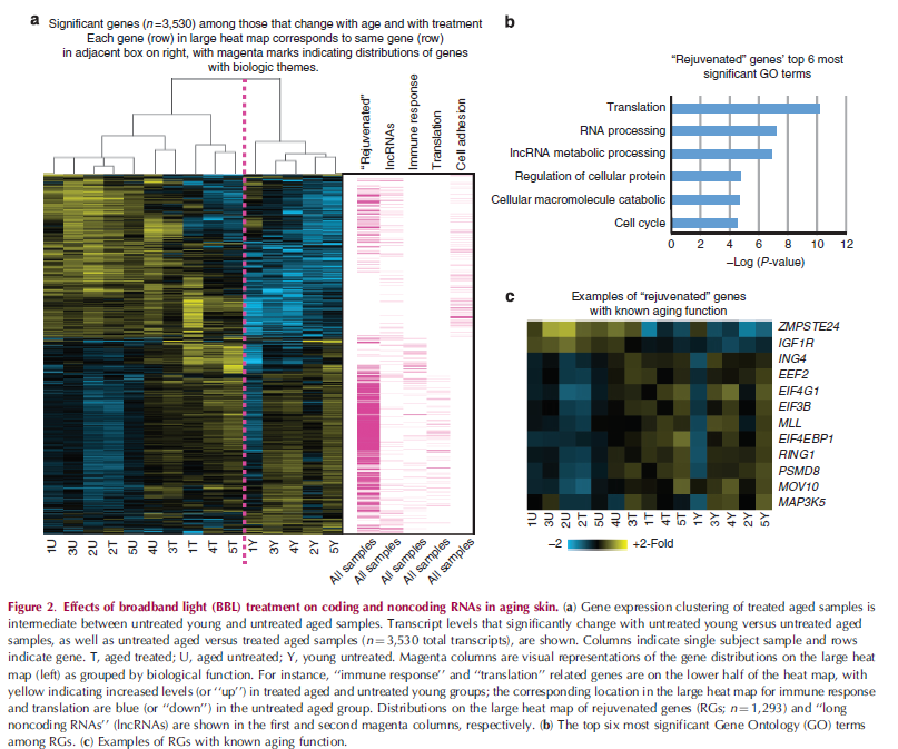 对于强脉冲光的基础研究也表明:强脉冲光并不是透支我们的皮肤潜力,相反还从基因层面会起到抗衰作用。一项BBL(也是强脉冲光的一种)的研究,对老年皮肤(未经过强脉冲光治疗)、老年经强脉冲光治疗的皮肤及青年皮肤进行基因水平的深度测序,发现经过强脉冲光治疗的老年皮肤基因的转录表达水平更趋向于青年皮肤。譬如被证实与人类衰老长寿密切相关的IGF1R、与秀丽隐杆线虫的寿命增加有关EIF4G1和EIF4EBP1基因。也就是说经过强脉冲光的治疗后,我们的皮肤基因“回春”了。