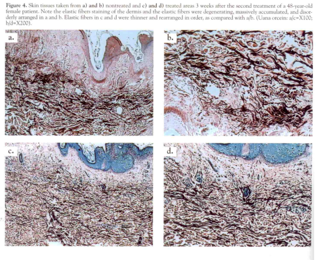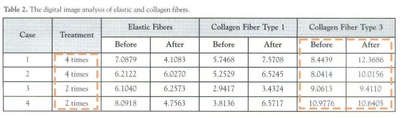 一项关于M22光子嫩肤治疗亚洲人皮肤光老化的临床及组织病理研究表明:在亚洲人种受试者接受每月1次频率的光子嫩肤后,I型胶原蛋白在2次和4次光子嫩肤后均出现有显著统计学意义的增加,而III型胶原蛋白,仅在4次治疗后方才出现明显增加 。